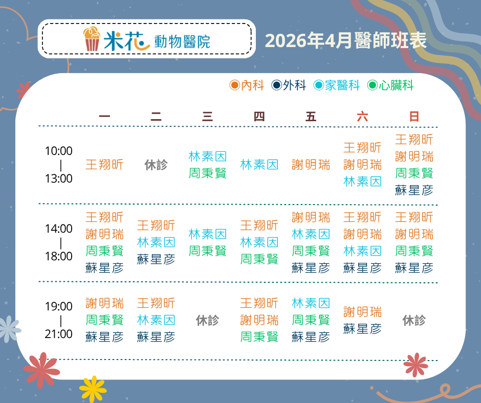為提供每位來院的毛小孩與家長最好的醫療品質,本院為「完全預約制」,恕不開放現場候診,請務必提前預約,謝謝! 預約方式及相關規定1. 請於營業時間來電 (03) 658-1042 預約,或填寫預約需求表單後,本院將於兩個工作天內協助您完成預約。目前不開放線上約診/諮詢喔!2. 本院會依您的需求為您安排合適的獸醫師看診,如有指定醫師看診請事先告知。3. 門診預約取消或改時間務必於約診時間至少『5小時前』來電告知,否則視為預約未到。4. 請務必於預約時間準時到診,若無故預約遲到將視現場狀況決定是否照常看診,遲到超過30分鐘視為預約未到。5. 預約未到累積達一定次數將影響未來預約順位。 就診前須知由於毛小孩在醫院時可能會因為緊張、興奮而表現出無法預期的行為(如逃脫或攻擊),為了保護院內毛小孩的安全,來院的狗狗請務必上好牽繩,貓咪請務必放置於封閉的外出籠內。如您的毛小孩就診時容易緊張害怕,為了避免影響檢查效率及結果,建議來電詢問是否需事先服用安神藥物。 當月班表及營業時間 全院休診日 4/3(五)早上,下午 14:00 開始營業 4/17(五)早上,下午 14:00 開始營業 4/18(六)晚上,當日營業至 18:00 謝明瑞醫師休診日:4/2(四)-4/3(五)、4/16(四)-4/20(一) 蘇星彥醫師休診日:4/17(五)-4/21(二) 林素因醫師休診日:4/3(五)- 4/4(六)、3/24(二) 周秉賢醫師休診日:4/12(日)、4/23(四)、4/27(一) 每月20日公布次月班表